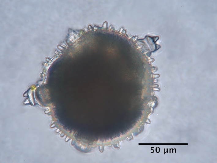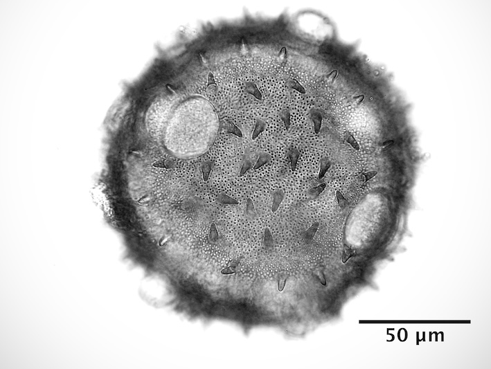 - hydrated pollen, release of the operculi (satellites around the pollen grain) - fresh, rehydrated (water), unstained, photographer: Gilot