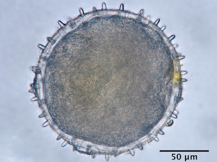 pollen unit: monad, dispersal unit and peculiarities: monad, size (pollen unit): very large (>100 µm), size of hydrated pollen (LM): >100 µm, shortest polar axis in equatorial view (LM): >100 µm, longest polar axis in equatorial view (LM): >100 µm, shortest diameter in equatorial or polar view (LM): >100 µm, longest diameter in equatorial or polar view (LM): >100 µm, pollen class: porate, polarity: -, P/E-ratio: -, shape: spheroidal, outline in polar view: circular, dominant orientation (LM): -, P/E-ratio (dry pollen): -, shape (dry pollen): -, outline in polar view (dry pollen): -, infoldings (dry pollen): -, aperture number: >6, aperture type: porus, aperture condition: porate, aperture peculiarities: operculum, pantoaperturate