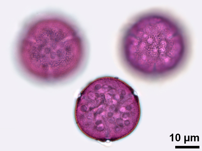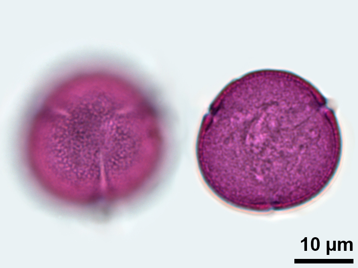 pollen unit: monad, dispersal unit and peculiarities: monad, size (pollen unit): -, size of hydrated pollen (LM): 26-30 µm, shortest polar axis in equatorial view (LM): 21-25 µm, longest polar axis in equatorial view (LM): 26-30 µm, shortest diameter in equatorial or polar view (LM): 21-25 µm, longest diameter in equatorial or polar view (LM): 31-35 µm, pollen class: colporate, polarity: isopolar, P/E-ratio: isodiametric, shape: spheroidal, outline in polar view: circular, dominant orientation (LM): oblique, P/E-ratio (dry pollen): -, shape (dry pollen): -, outline in polar view (dry pollen): -, infoldings (dry pollen): -, aperture number: 3, aperture type: colporus, aperture condition: tricolporate, colporate, aperture peculiarities: aperture membrane psilate