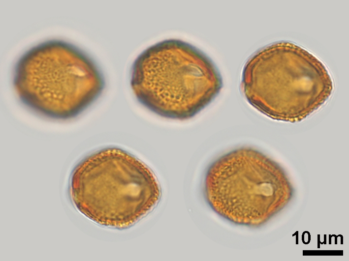 pollen unit: monad, dispersal unit and peculiarities: monad, size (pollen unit): small (10-25 µm), size of hydrated pollen (LM): 21-25 µm, shortest polar axis in equatorial view (LM): 21-25 µm, longest polar axis in equatorial view (LM): 21-25 µm, shortest diameter in equatorial or polar view (LM): 16-20 µm, longest diameter in equatorial or polar view (LM): 21-25 µm, pollen class: colporate, polarity: isopolar, P/E-ratio: isodiametric, shape: spheroidal, outline in polar view: circular, dominant orientation (LM): oblique, P/E-ratio (dry pollen): isodiametric, shape (dry pollen): spheroidal, outline in polar view (dry pollen): circular, infoldings (dry pollen): not infolded, aperture number: 3, aperture type: colporus, aperture condition: colporate, aperture peculiarities: -