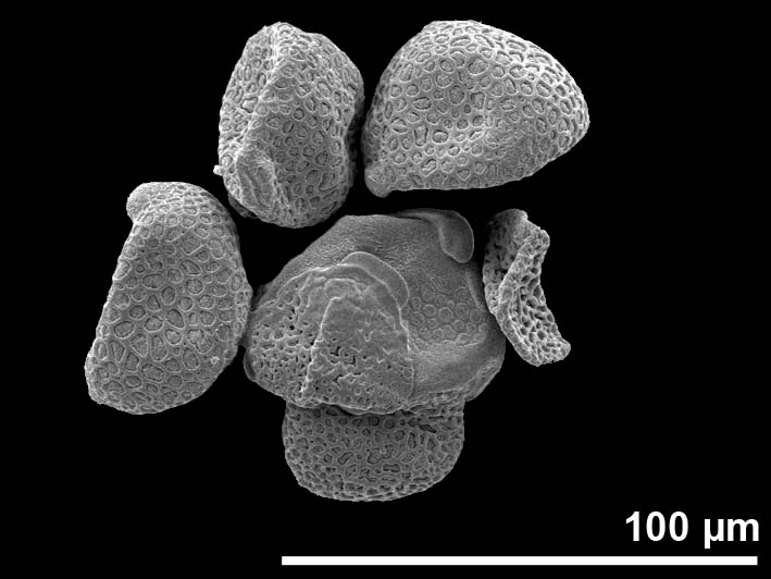 pollen unit: monad, dispersal unit and peculiarities: monad, size (pollen unit): large (51-100 µm), size of hydrated pollen (LM): -, shortest polar axis in equatorial view (LM): -, longest polar axis in equatorial view (LM): -, shortest diameter in equatorial or polar view (LM): -, longest diameter in equatorial or polar view (LM): -, pollen class: porate, polarity: -, P/E-ratio: -, shape: -, outline in polar view: -, dominant orientation (LM): -, P/E-ratio (dry pollen): -, shape (dry pollen): irregular, outline in polar view (dry pollen): irregular, infoldings (dry pollen): irregularly infolded, aperture number: number varies, aperture type: porus, aperture condition: porate, triporate, aperture peculiarities: -