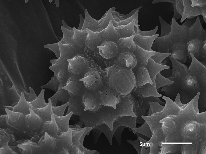 AsteraceaeSolidago canadensisflowers of Solidago canadensispollen grain with vegetative nucleus (left) and two sperm cellsupper focuspolar viewequatorial viewaperturepollen grain in cross sectioninterapertural area of pollen wallapertural area of pollen wall